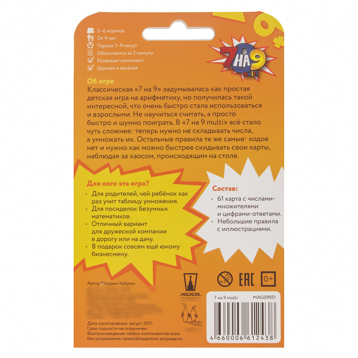 7 на 9 — это известная игра для всей семьи. В обычной 7 на 9 надо складывать числа, а в Мульти — умножать! Очень крутой тренажёр для того, чтобы дети закрепили таблицу умножения, а взрослые поняли, что забыли её, и надо учить снова. Играется быстро, шумно, весело, и партия проходит минут за 10, так что можно сыграть несколько раз, или играть в 7 на 9 в перерывах между сложными играми.