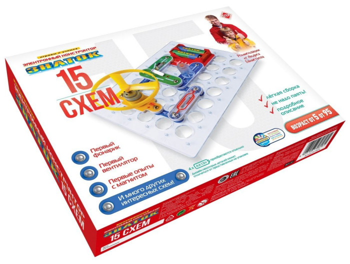 Электронный конструктор Знаток 999 схем позволяет познакомить ребёнка с интересным и увлекательным миром электроники. С его помощью можно собирать различные устройства на основе элементов электрических цепей, например, лампочек, светодиодов, индикаторов, измерителей, транзисторов, диодов, микрофонов, динамиков, конденсаторов, резисторов, коммутаторов, сенсоров, фоторезисторов и других деталей.