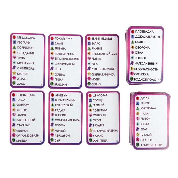 Игра включает: игровую доску, песочные часы, 6 фишек, 2400 слов на каждом языке.
