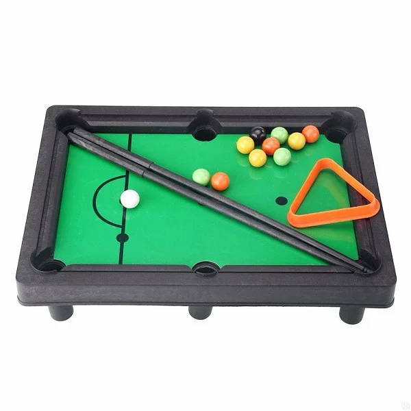 Все миниатюризировано для адекватной игры маленькими руками. Он поставляется со всем необходимым для мини-бильярдного стола, включая два кия, 16 шаров, меловые кубики и треугольник. Во время игры он будет стоять на столе, а после игры будет скользить в шкаф или под кровать.