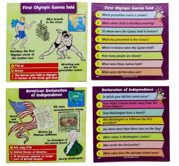 На обороте каждой карточки 8 вопросов: 4 на русском, с использованием английских слов, 4 на английском. Если игрок уже начал изучать английский, выбирайте второй блок вопросов — это будет ещё более полезной тренировкой.