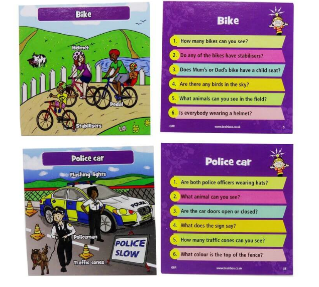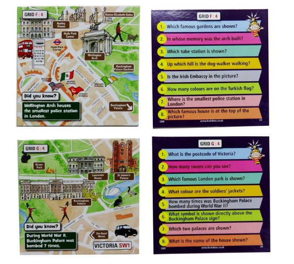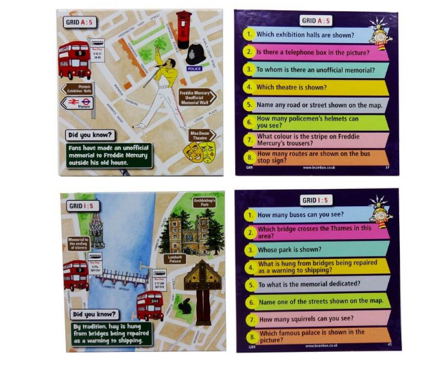 Вам понадобится внимательность и хорошая память: берёте картинку, изучаете её 10 секунд (в этом помогут песочные часы), стараясь запомнить все детали, слова и их перевод. Потом переворачиваете карточку и бросаете кубик. Выпавшее на кубике число — это номер вопроса, на который вам нужно ответить. Ответили правильно? Оставляйте карточку себе. Если нет — кладите её обратно в стопку.