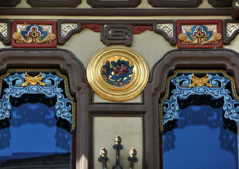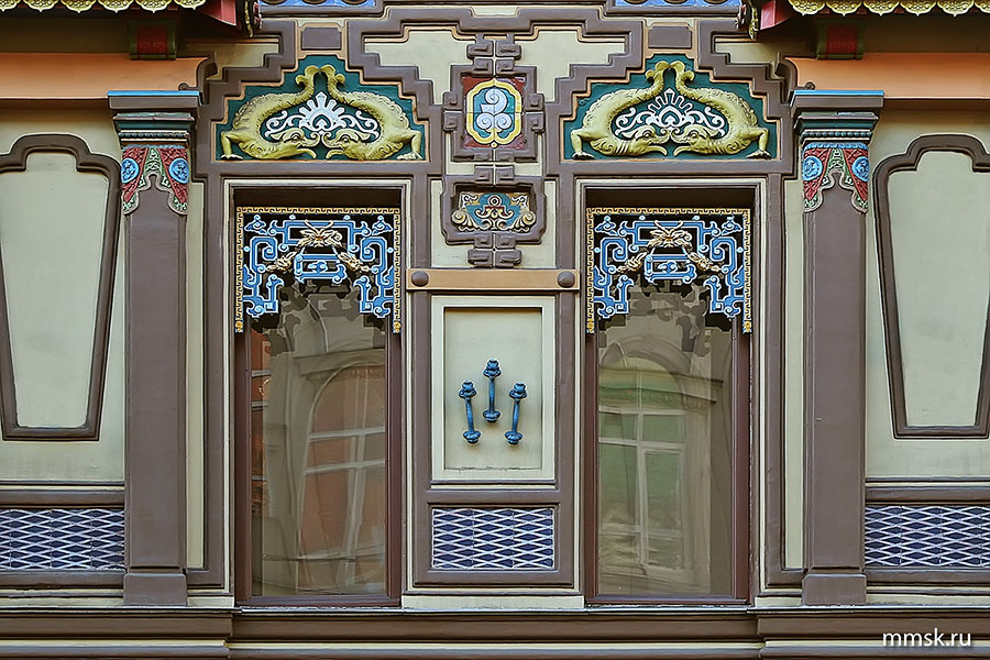 Фасад здания преобразился, он заиграл разноцветными красками на многочисленных стилизованных накладных керамических деталях. Разнообразные китайские орнаменты, причудливо переплетающиеся с мистическими драконами, полностью изменили внешний вид дома, который стал похож на красочную диковинную шкатулку, привезенную из дальних странствий. Особенное восхищение вызывала двухъярусная башенка «пагода», венчающая здание по центру фасада, она казалась, бесспорно, китайским атрибутом. Заслуживали внимание и рельеф стены с выносными кровельками из черепицы, кованые ворота, ограда крыши и балконов, которые гармонично завершали этот яркий архитектурный образ.