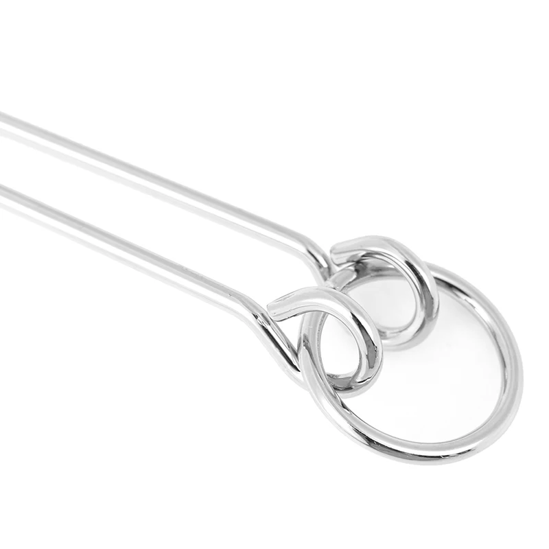 Для разгадки такой головоломки необходимо наложить дужку на дужку и слегка «перекосить» их. Теперь пропустите кольцо между лапками дужек и двигайте его вниз, затем вверх. Таким образом кольцо снимется.