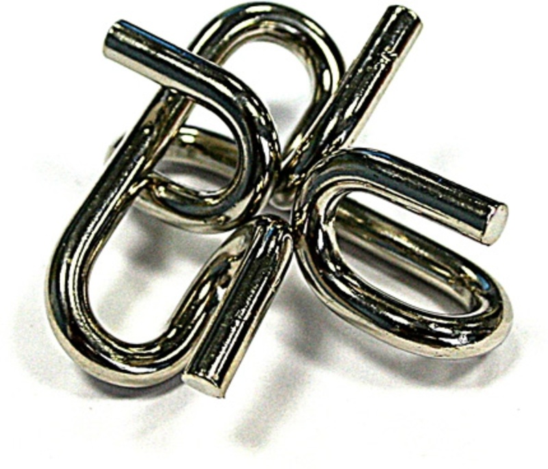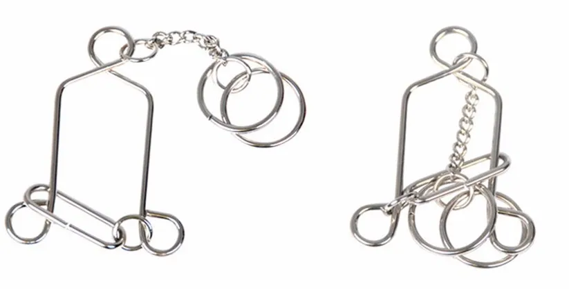 Задача играющих снять одну часть головоломки с другой, не разгибая и не ломая проволочных фигур.