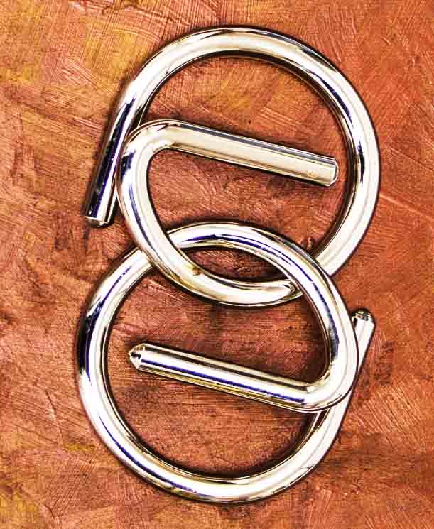 Смысл головоломки в том, чтобы не развязывая узелков, перенести одно кольцо к другому, затем перебросить их на противоположную сторону, а затем снова разъединить и перенести одно кольцо обратно на свою половину.