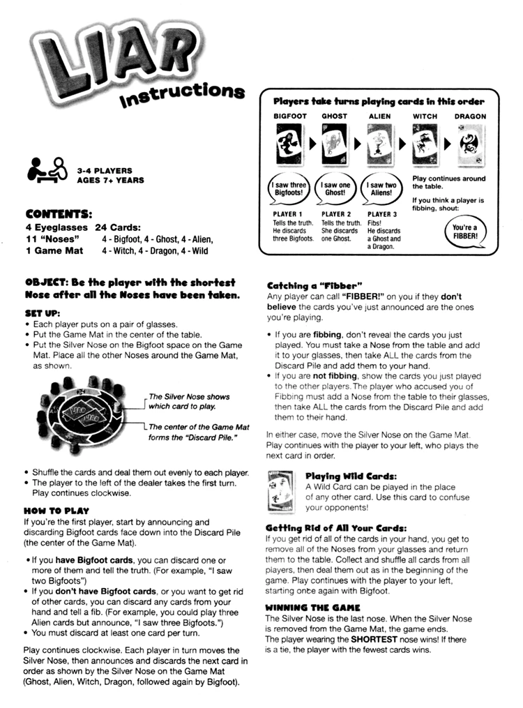 Подобно другим играм с ложью или выдумыванием, Фиббер привносит в нее творческий подход, фактически заставляя ваш нос расти с каждой выдумкой. Игроки носят очки с прикрепленными к ним носами. Если в конце игры у вас будет самый короткий нос, вы станете победителем.