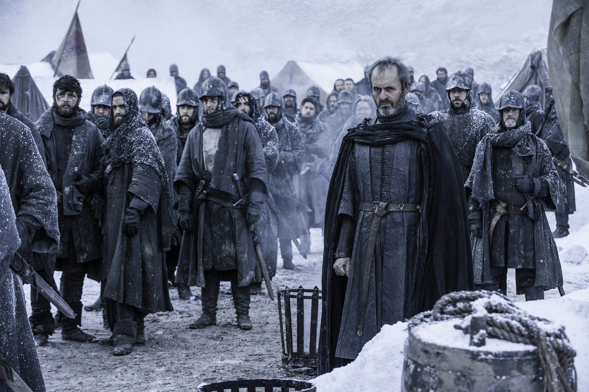 Когда его силы разбиты, Станнис отступает к Драконьему камню, где Мелисандра и ее насильственная религия получают власть, сжигая неверующих. Его главный советник Давос Сиворт борется против этого, сначала безуспешно, но в конечном итоге завоевывает лояльность Станниса, который делает его десницей. Он убеждает Станниса, что сообщение Ночного Дозора о предстоящем прибытии Белых Ходоков и одичалых реально. Станнис получает поддержку железного банка Браавоса, и с этими деньгами его армия перемещается на север, прибывая вовремя, чтобы победить армию одичалых.