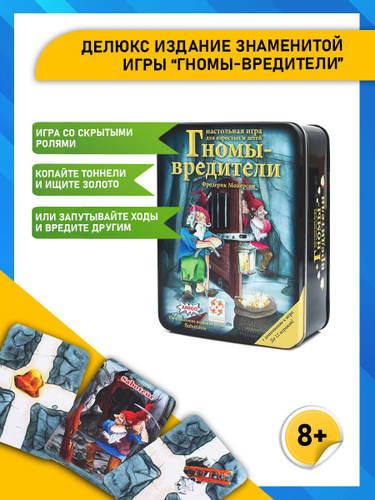 «Гномы-вредители» или Saboteur – это веселая и быстро развивающаяся карточная игра для 3-10 игроков. Чем больше участников, тем лучше. Она подходит для группы детей от 8 лет. Ребенку помладше будет сложно объяснить, как играть в «Гномов-вредителей».