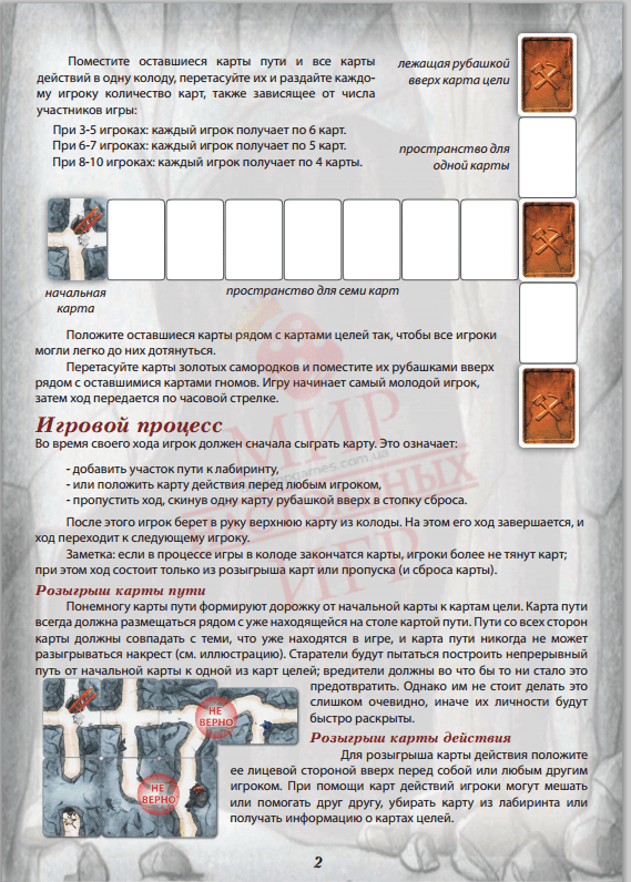 Игра «Гномы-вредители» – настольная, потому участникам понадобится плоская поверхность, чтобы выкладывать игровое поле. Перед началом первого раунда колоду делят на стопки по назначению карт. Среди тоннелей находят «вход в шахту» и располагают его на столе. Три карты золотой жилы перемешивают и кладут рубашкой вверх на расстоянии в 7 карт от начала тоннеля. Между каждой из них должно быть пространство в одну карту.