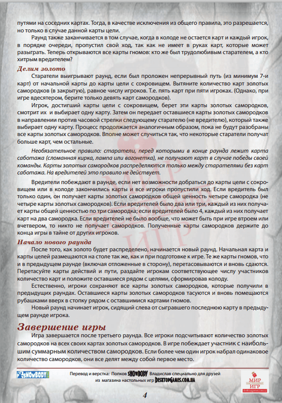 Задача команды добропорядочных гномов в каждом раунде: добраться до золота раньше, чем у всех игроков закончатся ходы. Вредители же всеми силами стараются этого не допустить. Но только на одной из трех карт находится самородок, потому в выборе правильного пути легко ошибиться. Побеждает команда, набравшая по результатам 3 раундов наибольшее количество золота.