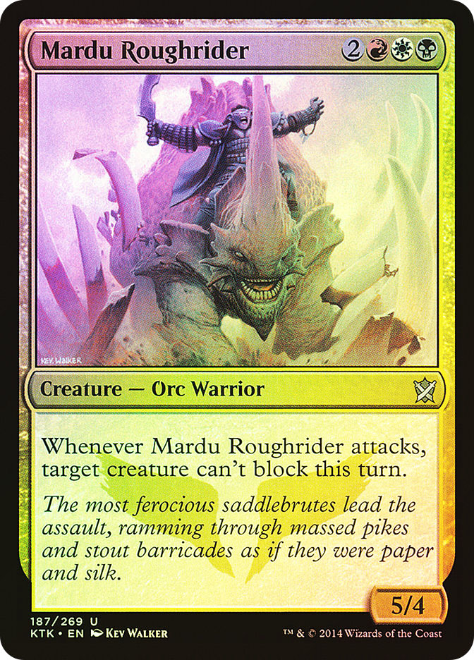 | Каждый раз, когда существо, не являющееся фишкой, под вашим контролем атакует, положите на поле битвы одну фишку существа 1/1 красный Гоблин повернутой и атакующей. Пожертвуйте Восхождение Марду: Существа под вашим контролем получают +0/+3 до конца хода. | |
