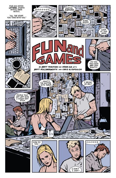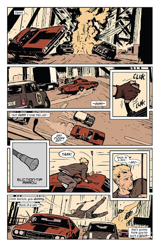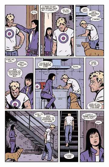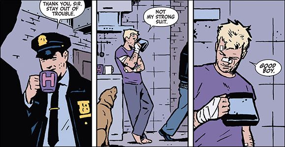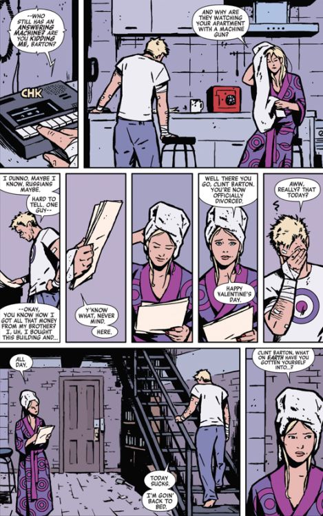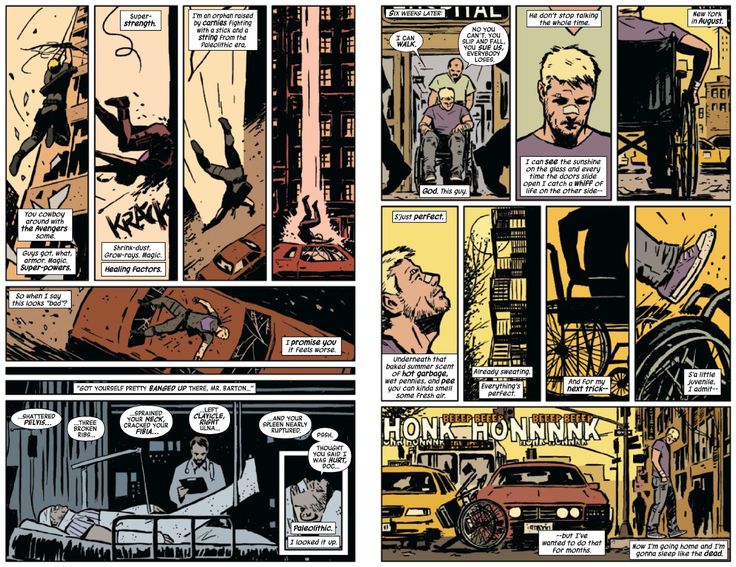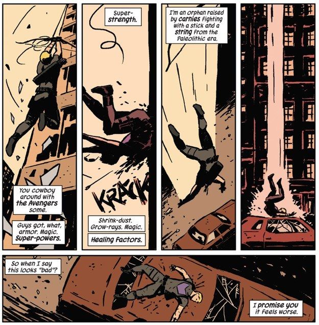 В этом первом томе мы знакомимся с героем и недостатками, которые делают его настоящим человеком, милым неудачником. Он обычный парень с большим талантом, из плоти и крови, который может истекать кровью и делает это часто. Фракция пишет правдоподобного персонажа, который, несмотря на всю свою грацию с луком и стрелами, неуклюж и человечен, но движим внутренним благородством и порядочностью. Мы наблюдаем уличную жизнь Бартона и тронуты его повседневной и обыденной радостью жизни, а также его испытаниями и невзгодами.