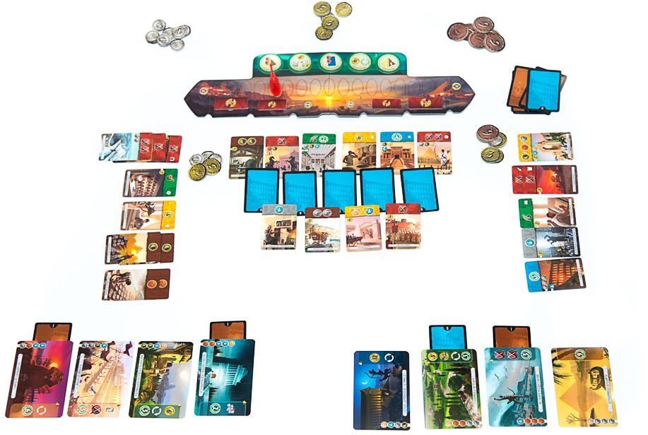 Нет «времени простоя». Цель состоит в том, чтобы разыграть эти карты в своем городе и построить чудо. У некоторых карт есть неотъемлемая стоимость, которую игроки должны оплачивать своими деньгами. Другие карты могут высвобождать или генерировать средства.