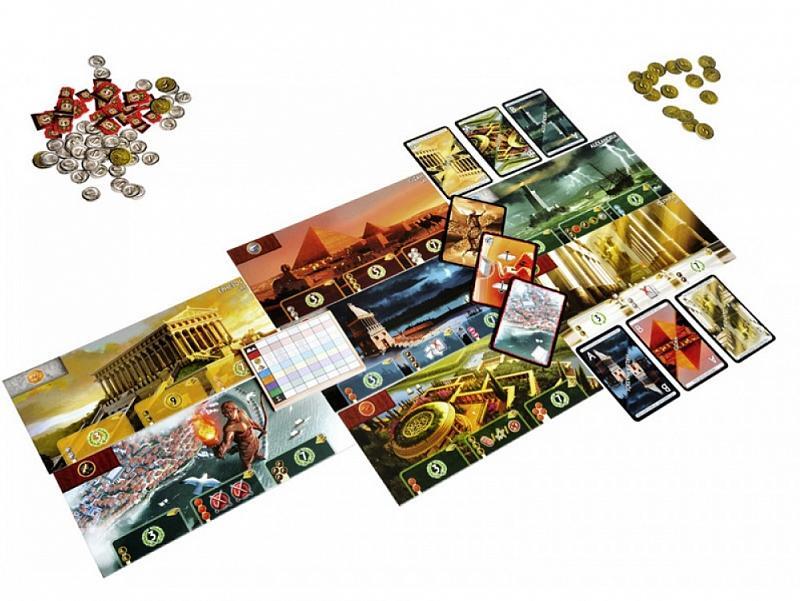 Карты из колоды I эпохи сразу же раздаются участникам. Затем каждому игроку достается по три монеты и двусторонний планшет цивилизации. Сторона «А» предназначена для начинающих игроков, а «Б» для более опытных. В левом верхнем углу планшета указан стартовый ресурс, которым обладает цивилизация. Туда же впоследствии будут размещаться карты построек, приносящих ресурсы. Снизу планшета расположено несколько слотов под этапы строительства чуда света, как правило, их три.