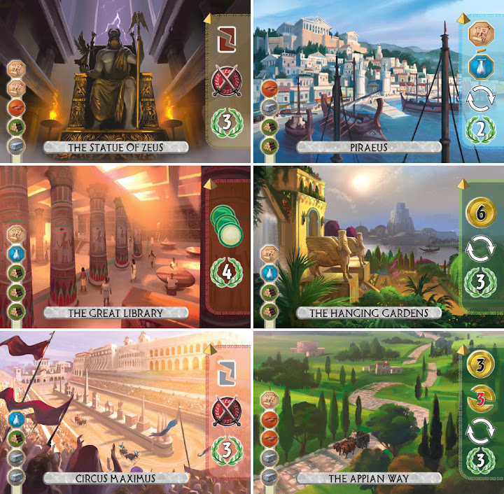 Вы в течение получаса строите что-то, что даже великолепные иллюстрации не в силах привязать к античному городу. И возведение в ходе игры чудес, вокруг которых, судя по названию, и должно все крутится, тоже не добавляет антуража – это просто дополнительные бонусы и с историческими чудесами они никак не связаны. В итоге «зацепиться» не за что и от этого становится грустно, потому что именно атмосфера в настольных играх творит чудеса.
