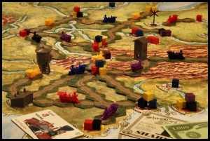 Автор этой игры, Мартин Уоллес, известен как мастер экономических стратегий, и эта — одна из самых известных. Гигантская карта восточной части США, где нам предстоит прокладывать железнодорожные пути вглубь континента, доставлять необходимые там товары, модернизировать свои поезда и главное — не слишком при этом залезать в кредиты. Впрочем, кроме хорошо слаженных игровых механик игру отличает еще и очень антуражное оформление и даже какие-то исторические сводки на тему развития железных дорог США (знаете ли вы, что первый паровоз, привезенный в Штаты был привезен в разобранном виде и без инструкции по сборке, но это уже совсем другая игра).
