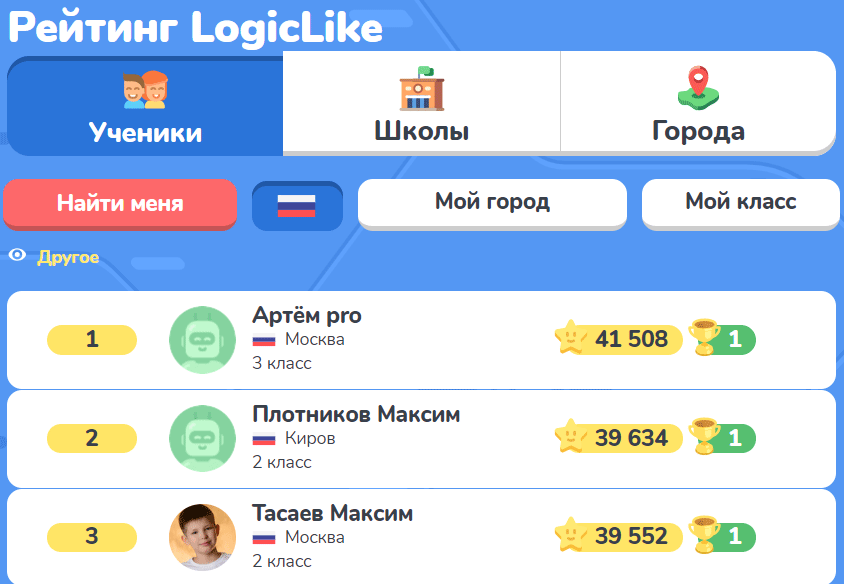 Психологи утверждают, что у детей с возраста 7-8 лет особенно ярко начинает проявляться стремление к лидерству и накоплению собственных достижений. Поэтому основным мотивом деятельности ребенка становится мотив достижения успеха. Также для младших школьников характерен эгоцентризм, а постоянно обновляемые рейтинги позволяют ему сравнить свои успехи с достижениями других ребят-ровесников, объективно оценить эффективность своих занятий по логике.