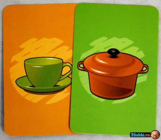 Первый игрок берет одну карту и кладет ее на стол картинкой вверх. Следующий игрок берет следующую карту. Если карта совпадает по цвету или относится к той же категории (например, чайник – чашка –
