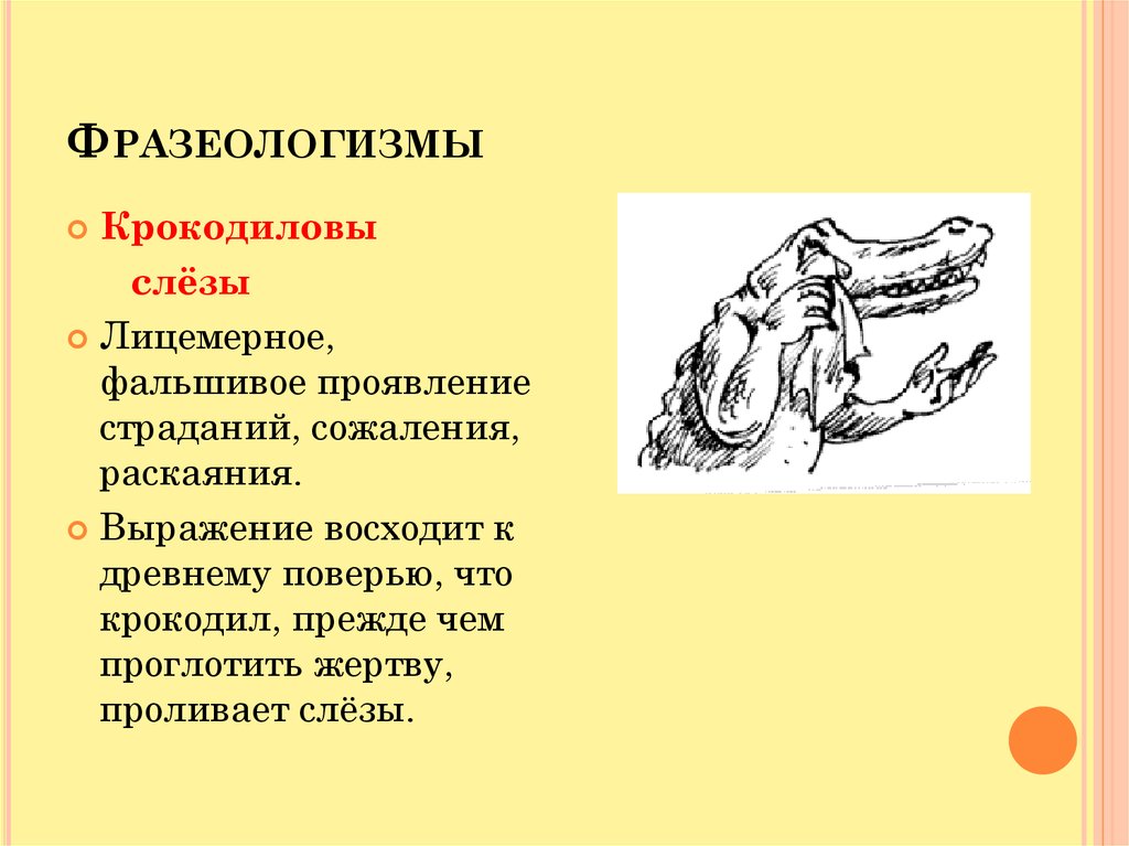 Конечно, расскажу, с удовольствием! Известно ли вам выражение «крокодиловы слёзы»? Плачут ли на самом деле крокодилы? По утверждению современных шведских учёных, крокодилы плачут, но не от «избытка чувств», а от избытка солей, которые скапливаются у них в организме и выходят через протоки, расположенные у самых глаз. Это выражение употребляется в значении «лицемерное покаяние или жалость, притворное сожаление , сострадание». Возникло это выражение из древнего поверья, будто бы крокодил перед тем , как съесть свою жертву, плачет. Рассказывают также, будто крокодил приманивает людей, подражая детскому плачу.