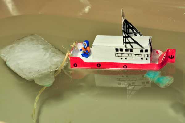 Можно в цветной воде с пеной запустить маленький кораблик и несколько замороженных льдин. И устроить исследование — что именно плывет перед кораблем — просто гигантская льдина или настоящий айсберг?
