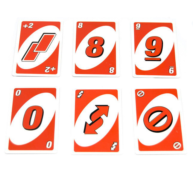 Специальные карты («Пропустить», «Вытянуть 2», «Обратное» и «Дикие карты») добавляют азарта и разнообразия в игру. Дикая карта может быть разыграна поверх любой карты. Другие специальные карты должны совпадать по цвету с ранее сыгранной картой или быть того же типа специальной карты. Вот как они работают:- Пропустить карту — Если игрок А разыгрывает пропускную карту, то ход игрока Б пропускается, и наступает ход игрока С (или ход игрока А, если игроков всего два). Игрок B не может отменить Пропускную карту, сыграв другую Пропускную карту, но Игрок C может затем разыграть другую Пропускную карту другого цвета.