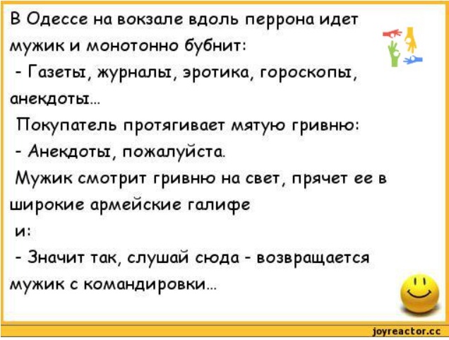 Вы бы мне сказали, что тоже едете в Харьков и что Вам негде ночевать. Я, как добрый человек, пригласил бы Вас к себе домой. А у меня молодая дочь. Вы бы ночью, наверняка, ее соблазнили и она бы от Вас забеременела. Вам пришлось бы на ней жениться.— Ну и что же из этого?! — воскликнул молодой человек.