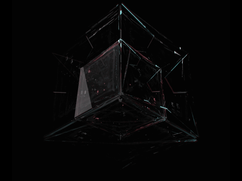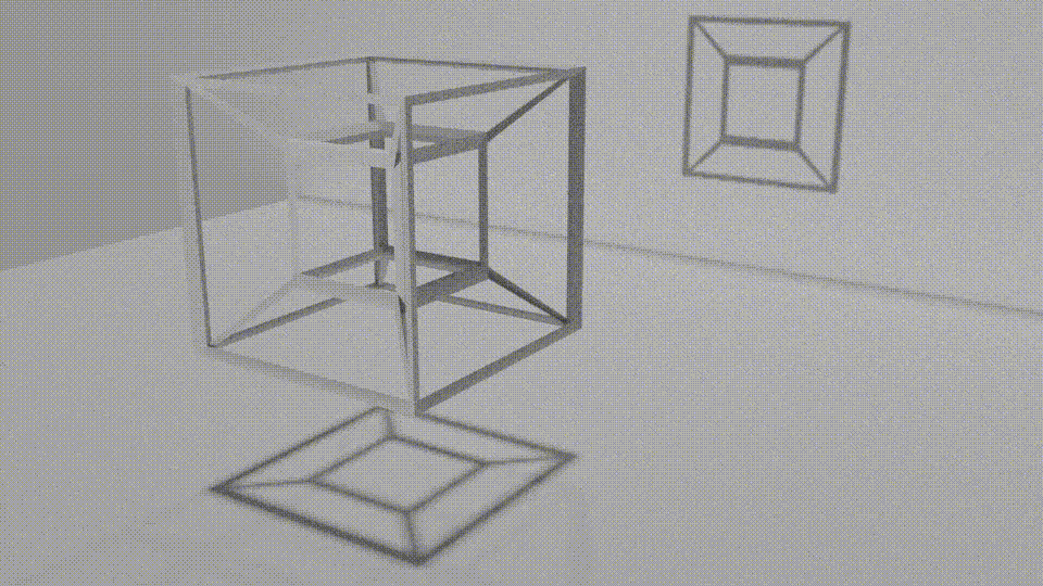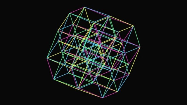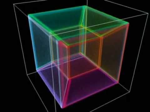 Красные и синие клетки деформируются наизнанку и поглощают друг друга. другое, но это лишь артефакт проекции в 3D. На самом деле они совершенно правильных кубов, двух противоположных ячеек тессеракта и ни деформируются и не касаются друг друга, вращаясь в 4D-пространстве.