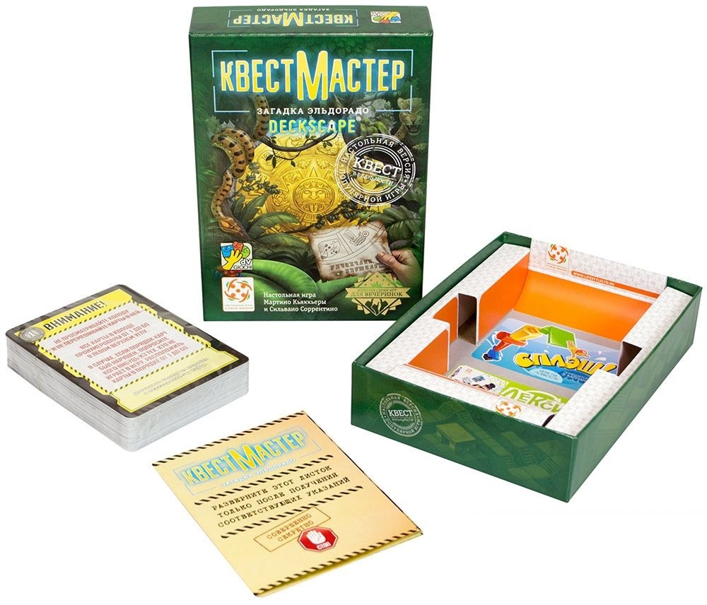 Серия настольных игр «КвестМастер» предлагает вам окунуться в уникальную атмосферу квеста не выходя из дома! Всё, что вам понадобится – карандаш, лист бумаги, ну, и, пожалуй, часы, чтобы следить, сколько времени проведено за игрой. Переверните верхнюю карту колоды и отправляйтесь навстречу загадкам и приключениям! Играть можно даже одному, хотя, в компании будет гораздо интереснее, ведь, как говорится, одна голова хорошо, а можно и вшестером поскрипеть мозгами! Для того, чтобы участвовать в таком квесте, особые навыки не требуются – играть могут все!
