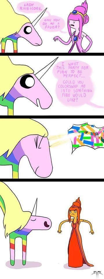 Леди Ливнерог всегда говорит по-корейски . Хотя сами они никогда не говорят на этом языке, Джейк и дети пары, похоже, также свободно говорят по-корейски. … Во «Времени приключений» Леди Рейнирог озвучивает Ники Янг, которая также является голосом БиМО.