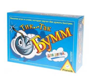 Интересная настольная игра, в которую одновременно может играть до 12 участников. В набор входит 55 карточек и бомбочка, которая приводится в действие нажатием кнопки. Участник игры должен назвать слово, имеющее отношение к тому, что нарисовано или написано на карточке. Если он будет очень долго думать, бомбочка «разразиться». Триумфатором считается тот, у кого бомба взрывалась реже всего.