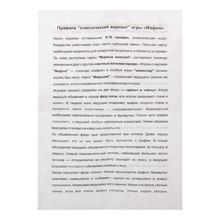 ▪ 6-8 игроков: две мафии, доктор, путана, комиссар, остальные мирные жители. Модификации и доп. персонажи по желанию.