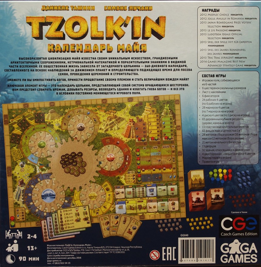 Цолькин: Календарь Майя (Tzolk’in: Mayan Calendar) — отличная настольная игра на механике миплплейсмент, необычная, завораживающая по реализации, с достаточно глубоким и сложным игровым процессом. Честная и крепкая настолка со жестким, бескомпромиссным характером. Для ценителей жанра евро обязательно присутствие её в коллекции, начинающим – в вишлист.