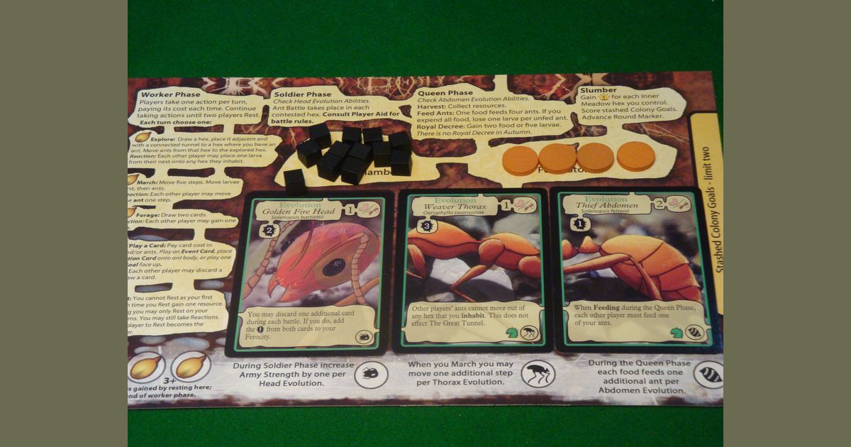 Каждый игрок начинает с тремя муравьями в размещенном гексе, тремя личинками в своей комнате для личинок, двумя продуктами питания в своих продовольственных магазинах и двумя картами. …