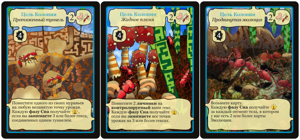 Кстати о картах, в игре есть колода, где их три типа. События, цели и эволюция. Эволюция уже упоминалась, она позволяет «прокачивать» муравьёв. События дают возможность сделать разовое мощное действие или совершить пакость по отношению к товарищу. Цель – это нечто глобальное, что приносит очки в финале игры или каждый ход.