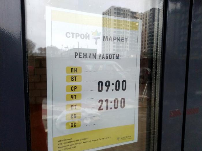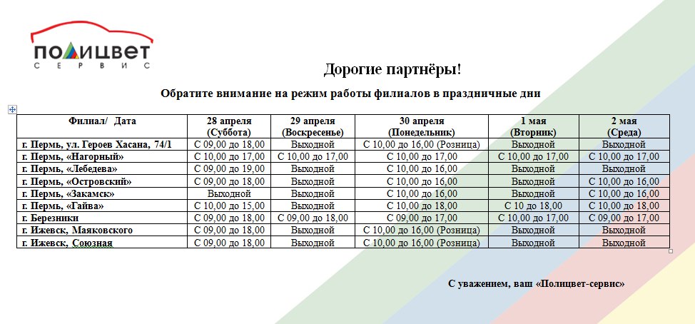График работы: 1 мая — работает с 9:00 до 18:00; 2 мая — выходной; 3,4,5,6,7 мая — работает с 9:00 до 20:00; 8,9 мая — выходной;10 мая и далее в обычном режиме.