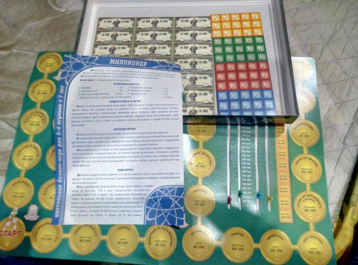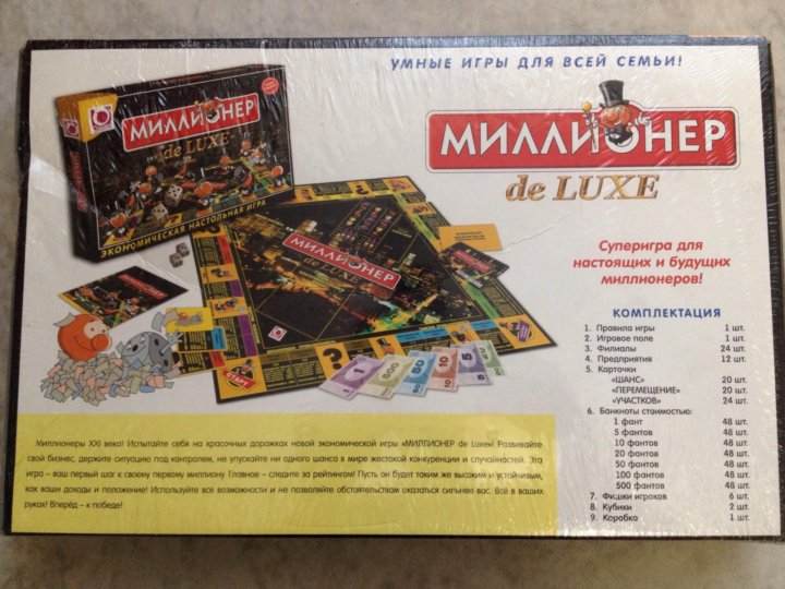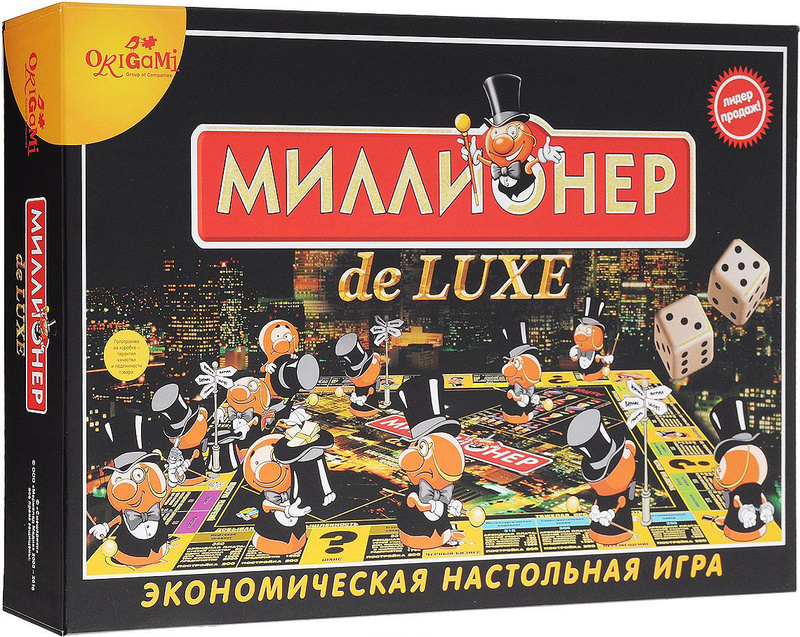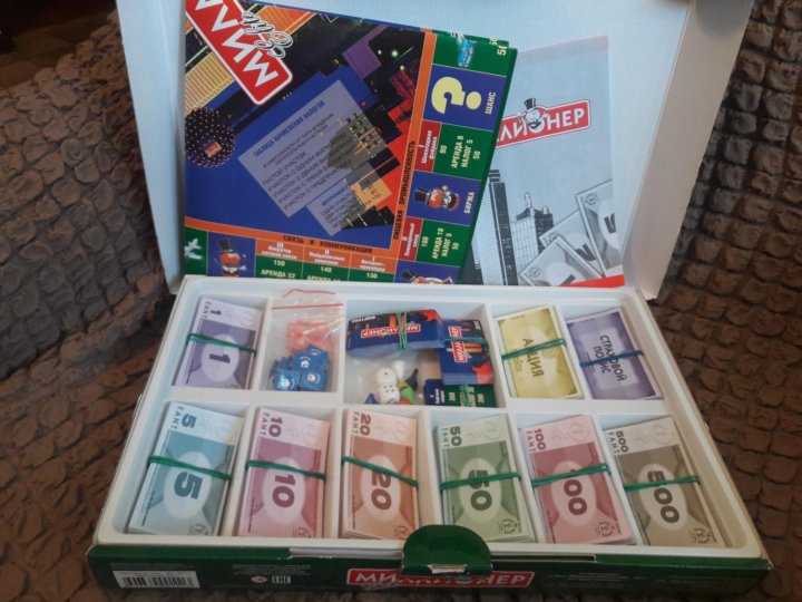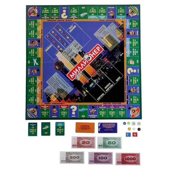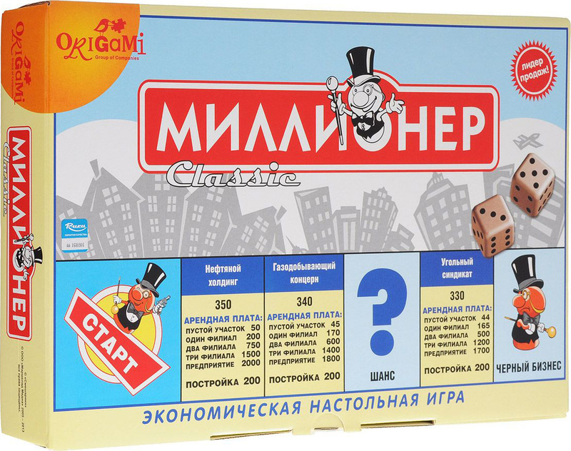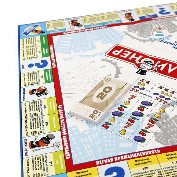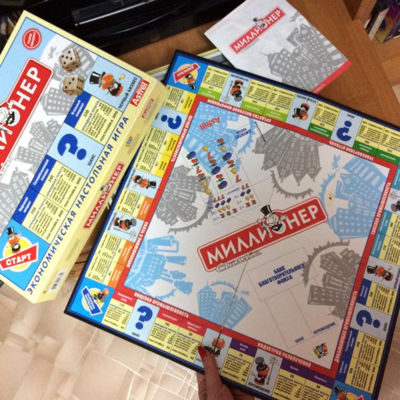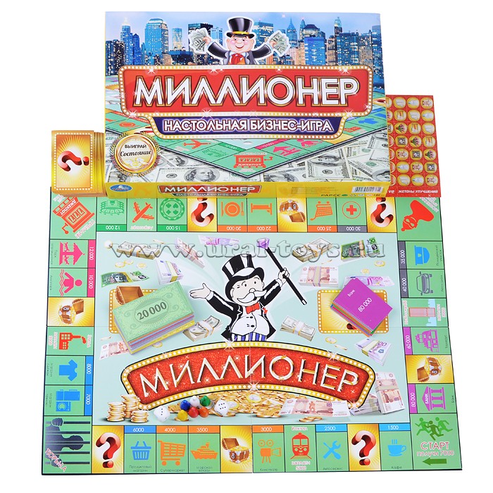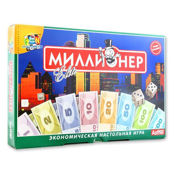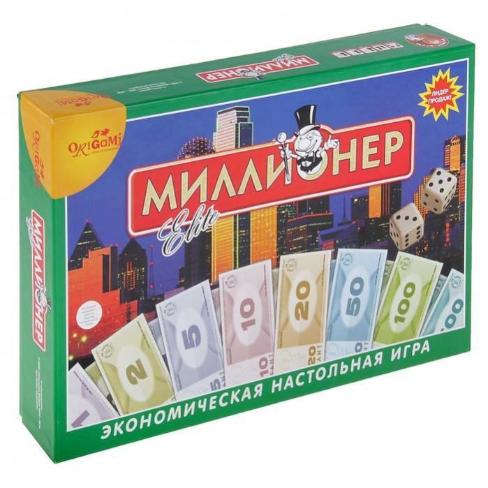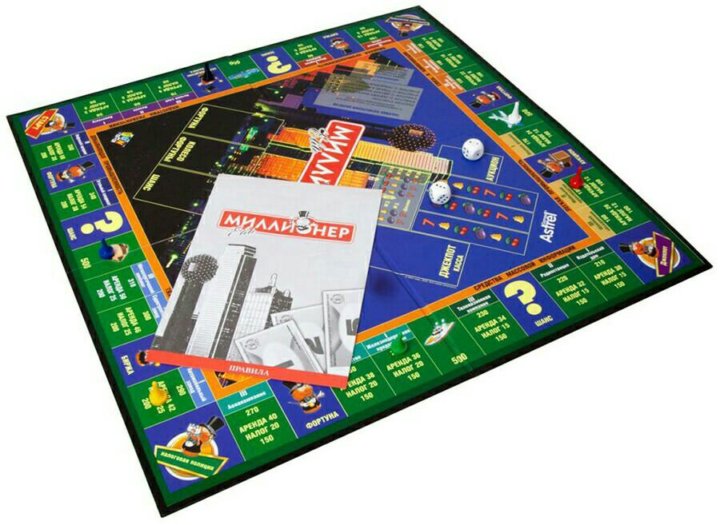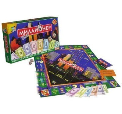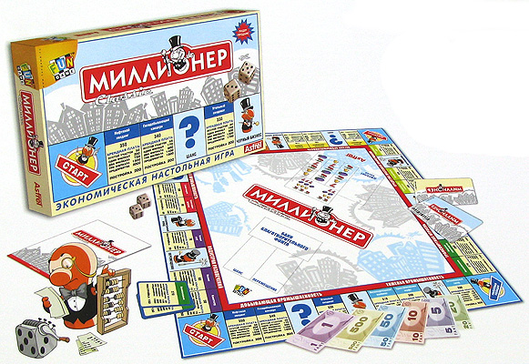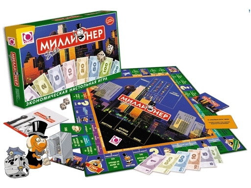 В последнюю очередь опишем настольную бизнес-игру «Миллионер», правила игры освоят даже дети. Основная цель игры — разбогатеть, скупая банки, магазины, кинотеатры и т. д.