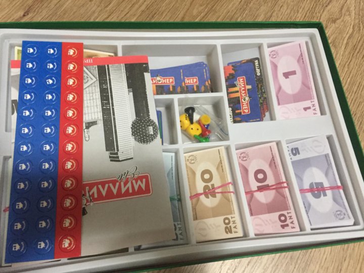 В специальном отделении раздельно сложены «деньги» для ведения бизнеса. Банкноты разного номинала (1, 5, 10, 20, 50, 100, 500), в каждой пачке 48 штук. Деньги в игре называются «фантами». Еще в комплект входят карточки филиалов (24 шт.) и предприятий (12 шт.). Существуют еще и призовые карточки под названием «Шанс» и «Перемещение». Их в наборе по 20 штук. Также есть обозначения участков, которых 24.