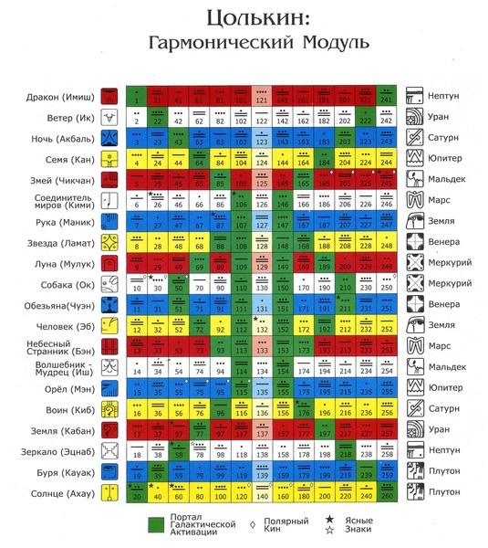 Модуль Цолькина это расписание электромагнитных волн приходящих из галактики. Каждая волна имеет длину 13 дней. Всего волн 20. 13Х20=260 дней. Это представляет собой матрицу, которую Вы видите на рисунке.