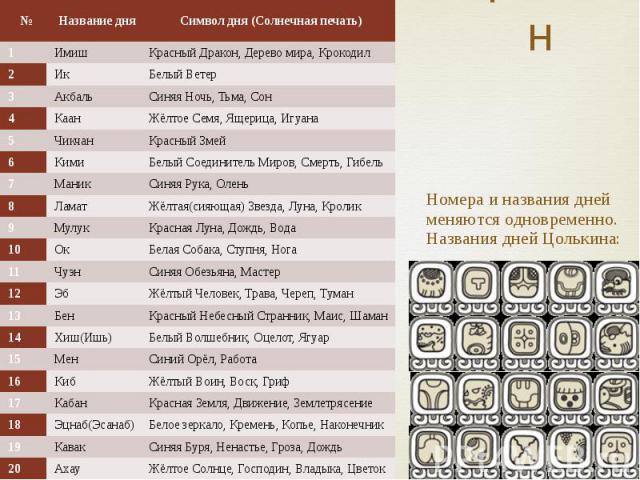Здесь будет изложено только то, что необходимо знать для прогнозирования фондового рынка. Модуль Цолькина состоит из 260 дней – 260 кинов. Как только заканчивается один период в 260 дней, за ним следует другой в 260 кинов. Счет ведется с древних времен. Какой сегодня день по календарю Вы можете узнать на сайте http://yamaya.ru/maya/choosedate/.