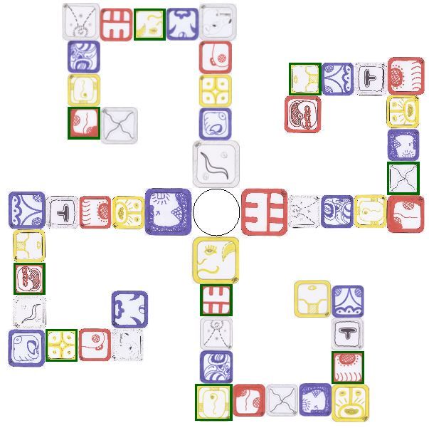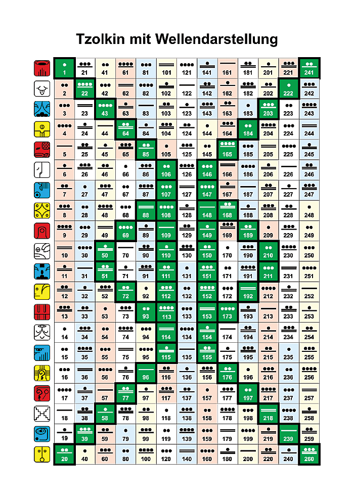 13 столбцов содержат 260 Кинов от Кина 1 в верхнем левом углу до Кина 20, продолжая в верхней части второго столбца и так далее, пока не достигнете Кина 260.
