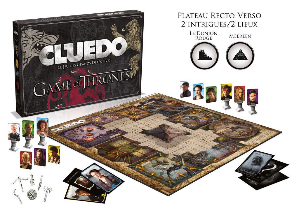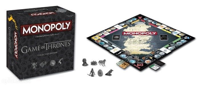 В комплект Монополии: «Игра престолов» входят коллекционные фишки: лютоволк, яйцо дракона, белый ходок, трехглазый ворон, корона и железный трон. Вместо обычных домов и отелей — деревни и крепости. Вместо стандартного игрового поля, теперь оно будет состоять из знакомых для поклонников 7 королевств локаций. Железнодорожные станции заменены на Великие Дома из сериала. Все задания взяты из сюжета сериала или книги.