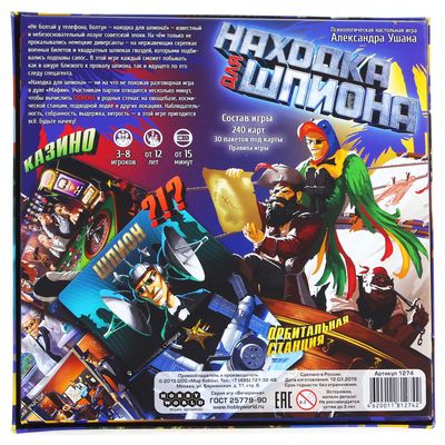 Описание: В настольной игре «Находка для шпиона» вы сможете побывать как в шкуре шпиона некоего правительства, так и идущего по его следу спецагента — контршпиона. Данная игра относится к жанру салонной игры, то есть напоминает известную «Мафию», но не требует отдельного игрока под роль ведущего, играть будут все! Один или два игрока возьмут роли шпионов, а все остальные попробуют вычислить их. Ограничение по времени на раунд, множество различных ролей и локаций, которые нужно вычислить шпиону, а также общий накал страстей по ходу игры гарантируют вам невероятно увлекательное времяпровождение!