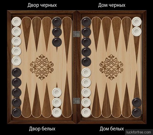 Как показано на примере игральная доска состоит из двадцати четырех треугольников, называемых пунктами, и делится на четыре квадранта. Каждый квадрант состоит из шести пунктов. Квадранты носят следующие названия: Дом черных, Двор белых, (т.е. ваши Дом и Двор, а также Дом и Двор вашего соперника).