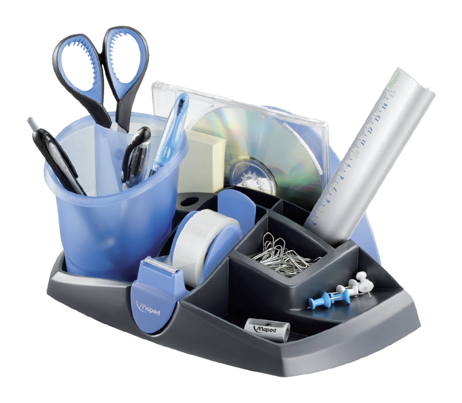 В комплекте: степлер № 10, 1000 скоб, 2 карандаша, 2 ручки, 30 скрепок, ластик, точилка, линейка, ножницы, нож канцелярский, блок бумаги для записей.