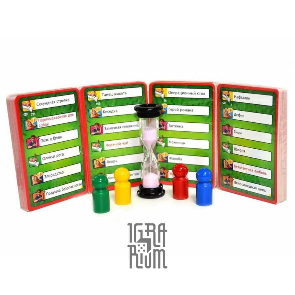 В оригинальной версии 440 карт. У них рубашки разного цвета по тематике задания. Как и на игровом поле, цифра на рубашке также обозначает степень сложности шарады. Внутри карты записано слово-задание, которое и нужно будет объяснять жестами, рисунком или просто словами. Количество карт в колоде может различаться в зависимости от версии игрового сета.