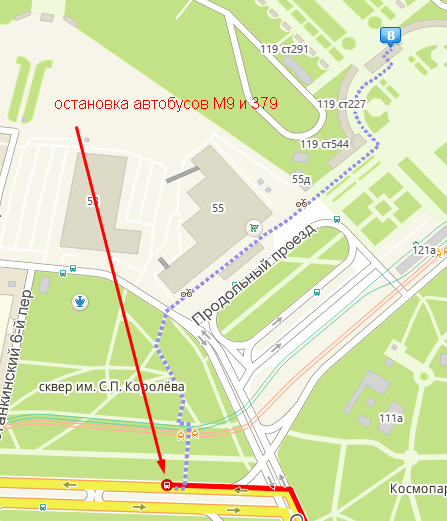 Aus U-Bahn-Station WDNCh Straßenbahn Nummer 17 — bis zur Haltestelle «Платформа Северянина» фарен. Busse 93, 903, 136, 172, 244 или Minibusse doppelte Busnummern. Obusse 14, 76 bis zur Haltestelle «Ростокинский ремзавод».