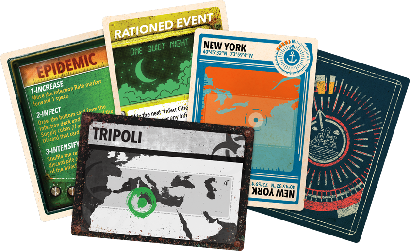 - Карты игрока: 36 карт городов, 5 карт эпидемий, 4 карты планируемых событий, 8 карт производства снабжения. Это ваши знания, опыт и груз.