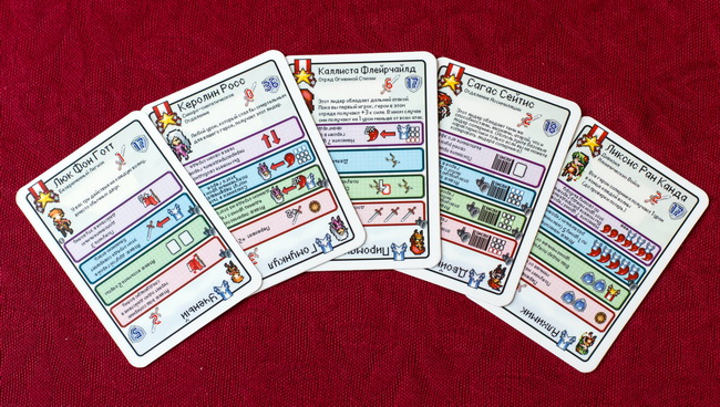 Каждому герою (поверните карту необходимой стороной вверх) соответствует определённая способность, зависящая от месторасположения отряда: авангард использует красный текстовый блок, фланги — синий, а тыл — зелёный.