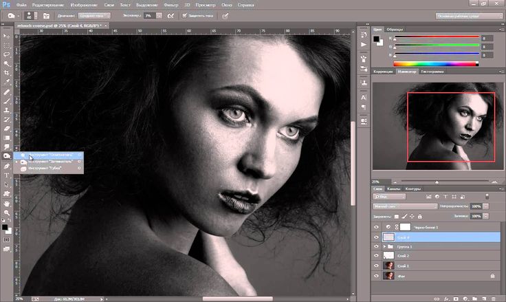 Впрочем, вы можете пользоваться и штатными инструментами Adobe Photoshop. Например, можно применить черно-белое преобразование, а затем наложить от лица модели центральный градиент. При этом лицо станет сверкать прежними красками, а по мере удаления от центра картинка будет обесцвечиваться.